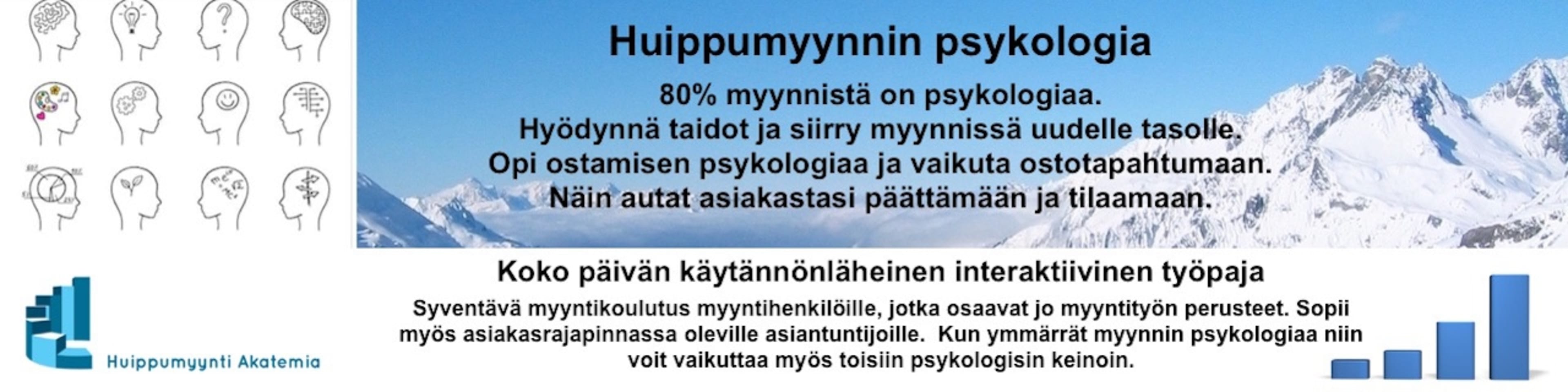 Huippumyynnin psykologia on syventävä myyntikoulutus myyntihenkilöille, jotka osaavat jo myyntityön perusteet. Sopii myös asiakasrajapinnassa oleville asiantuntijoille. Kun ymmärrät myynnin psykologiaa niin voit vaikuttaa myös toisiin psykologisin keinoin.