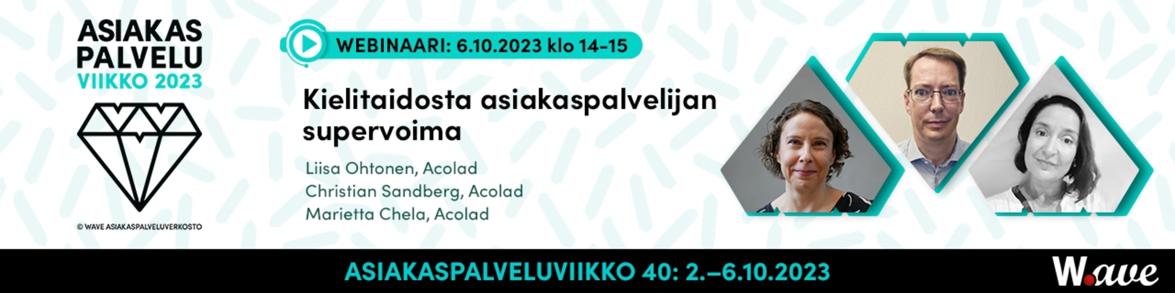 Tämä webinaari on maksuton ja osa Asiakaspalveluviikon ohjelmaa. Wave järjestää vuosittain Asiakaspalveluviikon, joka nostaa asiakastyön arvostusta ja motivoi alalla toimivia. Samalla se tarjoaa oivan paikan viestiä ja näkyä positiivisesti. Tutustu Asiakaspalveluviikkoon!