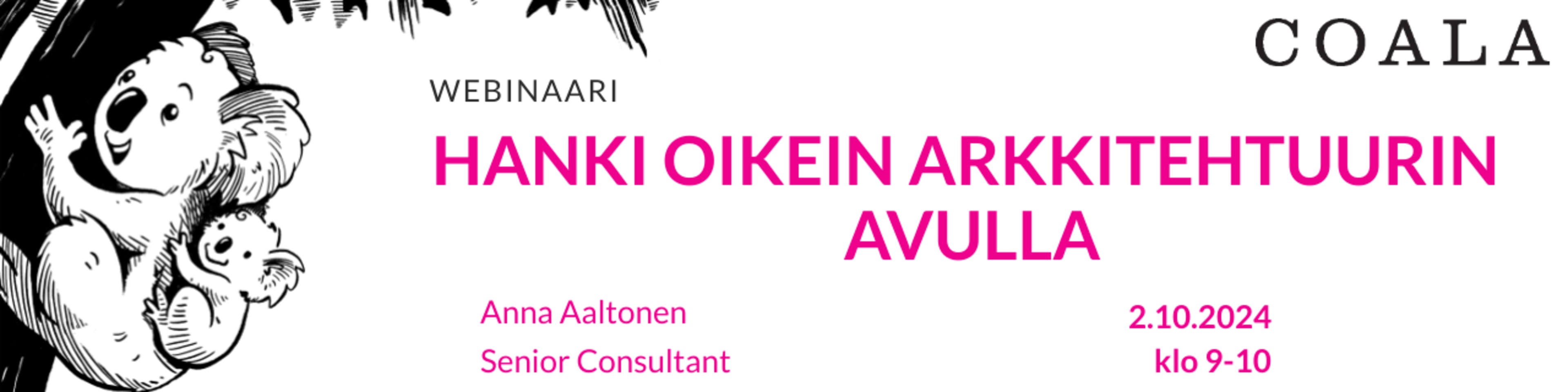 9.00-10:00 Hanki oikein arkkitehtuurin avulla. Puhuja: Anna Aaltonen, Senior Consultant (Coala)