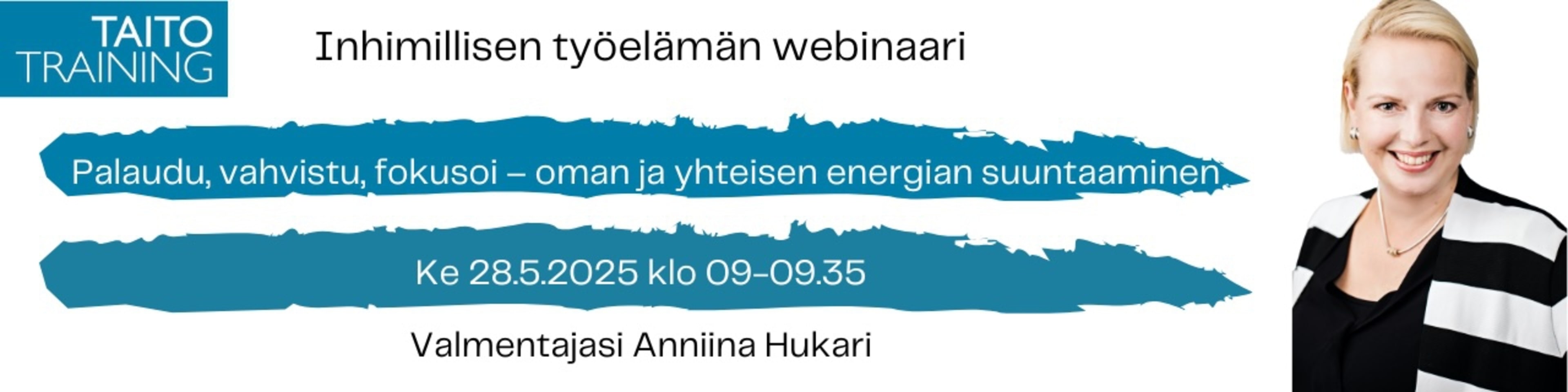 Tämä webinaari on jatkoa Fokusoi onnistumisiin – valjasta mielesi voima tietoisesti -webinaarille ja syventää ymmärrystäsi siitä, miten voit ohjata sekä omaa että yhteisön energiaa tietoisesti ja rakentavasti. Voit hyvin osallistua vaikket päässytkään ensimmäiseen osaan mukaan tai pyytää tallenteen (anniina@taitotraining.fi).
