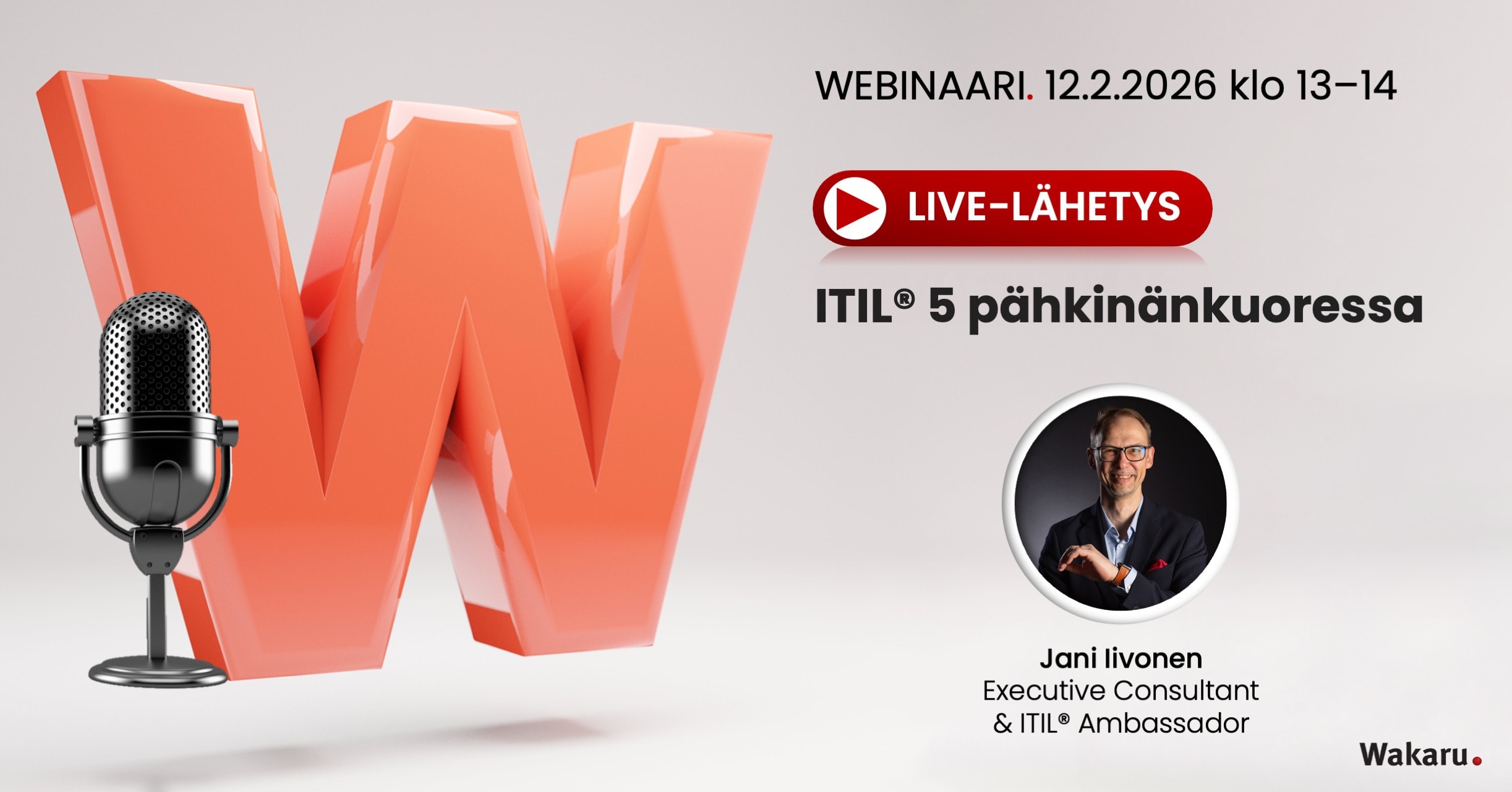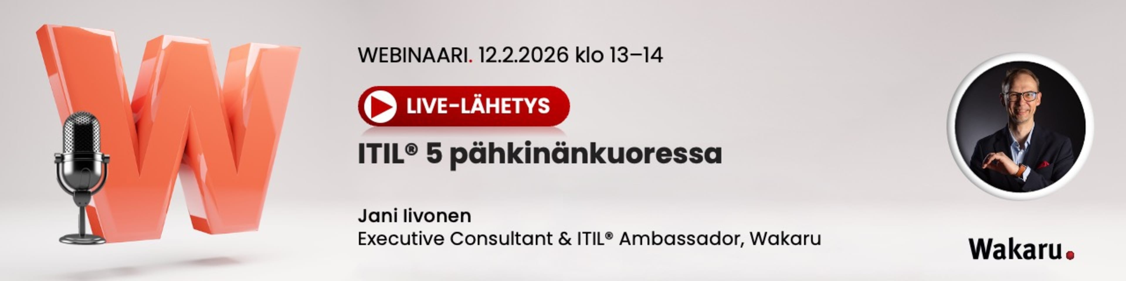 Julkaistu tieto ITIL-viitekehyksen päivitetystä versiosta on ilouutinen monelle, myös meille Wakarulaisille. ITIL 5 on tehty vastaamaan tämän päivän palvelunhallinnan ja -johtamisen todellisuuteen, jossa digipalveluita ja -tuotteita rakennetaan yhdessä, toimintaympäristö muuttuu nopeasti ja tekoälystä on tullut osa arkea. Se on viitekehyksenä entistä käytännöllisempi, joustavampi ja liiketoimintalähtöisempi – ja auttaa viemään kehittämisen, operoinnin ja asiakaskokemuksen samaan suuntaan.
