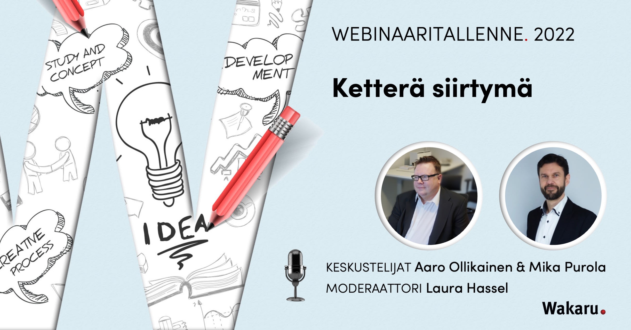 Kuuntele keskustelu siitä, mistä on kyse ketterässä siirtymässä. Keskustelijoina ovat Wakarun projektijohtamisen ja konsultoinnin päävalmentaja Aaro Ollikainen sekä Executive Consultant Mika Purola, jotka vastaavat kysymyksiin projektijohtamiseen liittyvästä ketteryydestä ja siitä, mitä käytännössä tarkoittaa ketterä siirtymä.