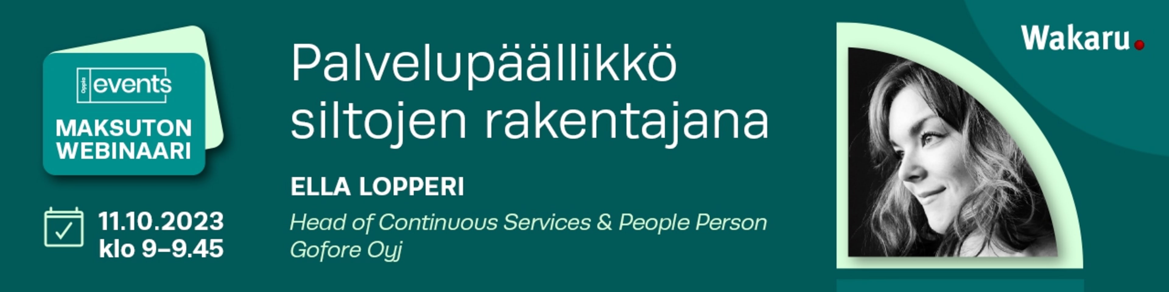Palvelupäällikkö on paljon vartijana. Toiminta asiakkaan, toimittajaverkoston ja sisäisten sidosryhmien välillä vaatii monenlaisia taitoja. Tässä webinaarissa Goforen Ella Lopperi kertoo palvelupäällikön roolista organisaatiossa. Paljon puhutaan palvelupäällikön merkityksestä asiakkaan näkökulmasta, mutta miten palvelupäällikön rooli näyttäytyy organisaation sisällä? Tervetuloa kuulemaan, millä tavoin palvelupäällikkö ja organisaatio voivat tukea toinen toistaan, ja millainen palvelupäällikön rooli on osana Goforen asiantuntijayhteisöä.