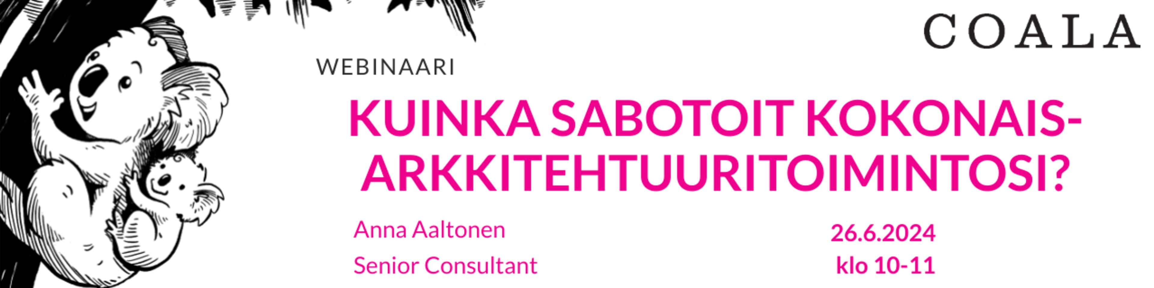10.00-11:00 Kuinka sabotoit kokonaisarkkitehtuuritoimintosi? Puhuja: Anna Aaltonen, Senior Consultant (Coala)