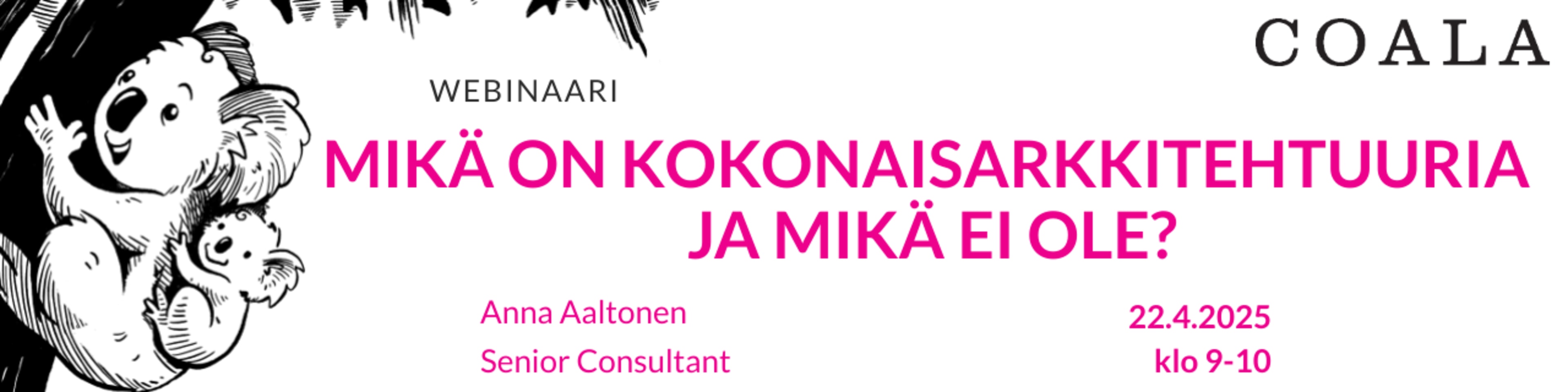 9.00-10:00 Mikä on kokonaisarkkitehtuuria ja mikä ei ole? Puhuja: Anna Aaltonen, Senior Consultant (Coala)