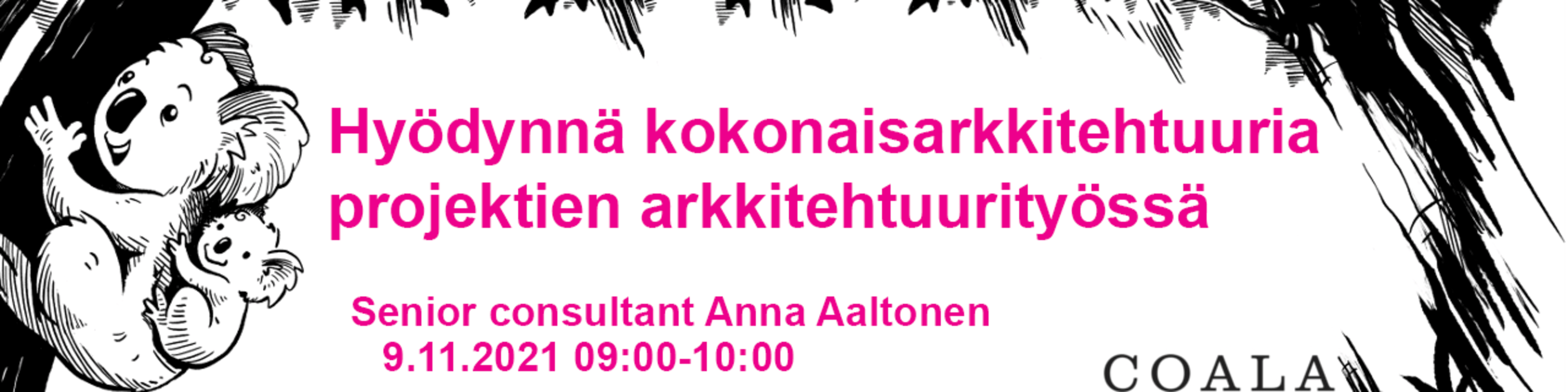 9.00-9.45 Hyödynnä kokonaisarkkitehtuuria projektien arkkitehtuurityössä Puhuja: Anna Aaltonen, Senior Consultant (Coala)