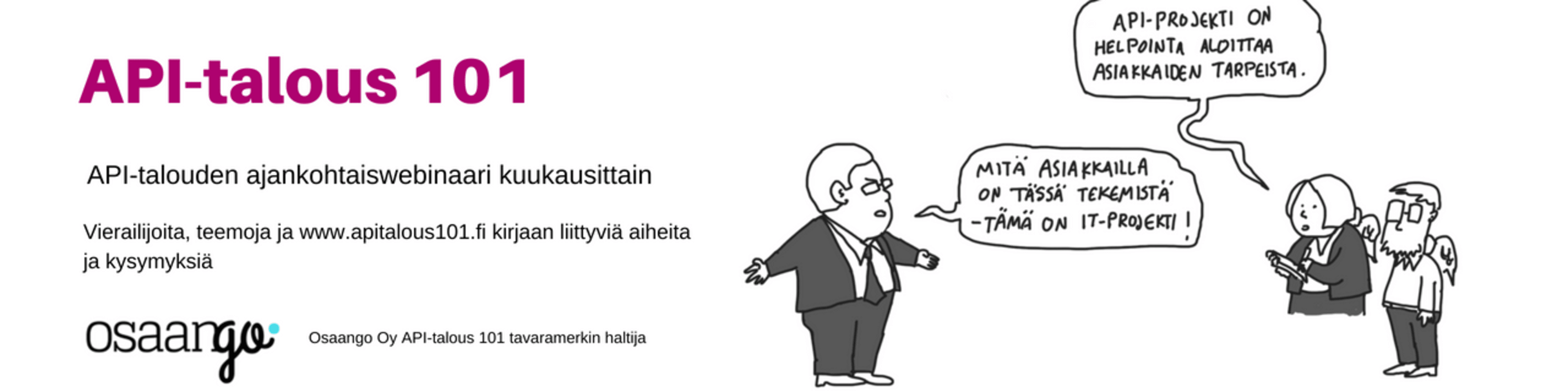 Webinaarista vastaa Marjukka Niinioja, Founding partner Osaango Oy. Jos olet kiinnostunut esittelemään omia kokemuksia API-talous -hankkeista tai haluat vastauksia tiettyihin mieltä painaviin kysymyksiin tai haluat antaa palautetta API-talous 101 -kirjasta, otathan yhteyttä info@osaango.com mieluiten ennen webinaarin tarkemman kuvauksen julkaisemista.
