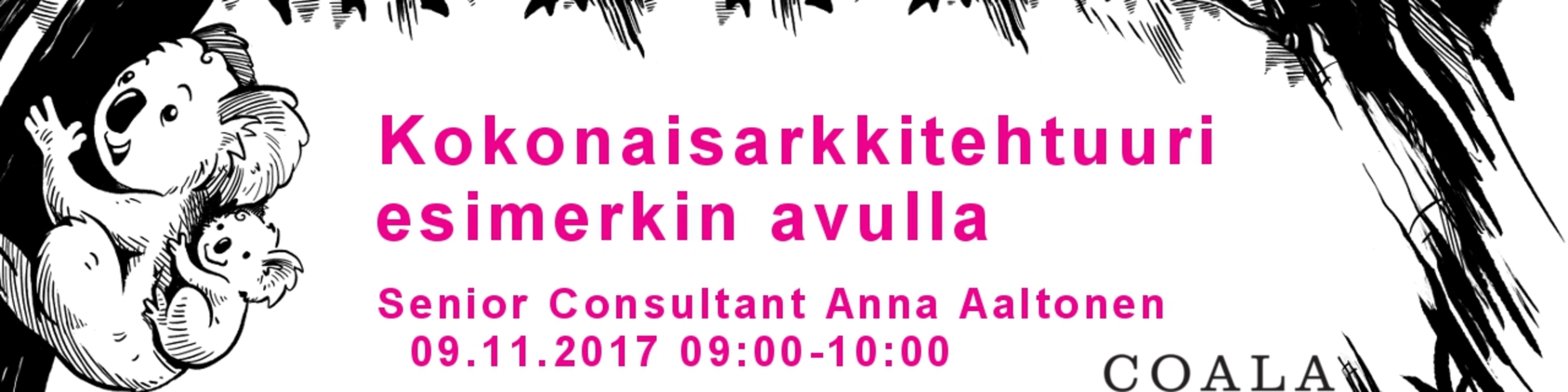 9.00-9.45 Kokonaisarkkitehtuuri esimerkin avulla Puhuja: Anna Aaltonen, Senior Consultant (Coala)