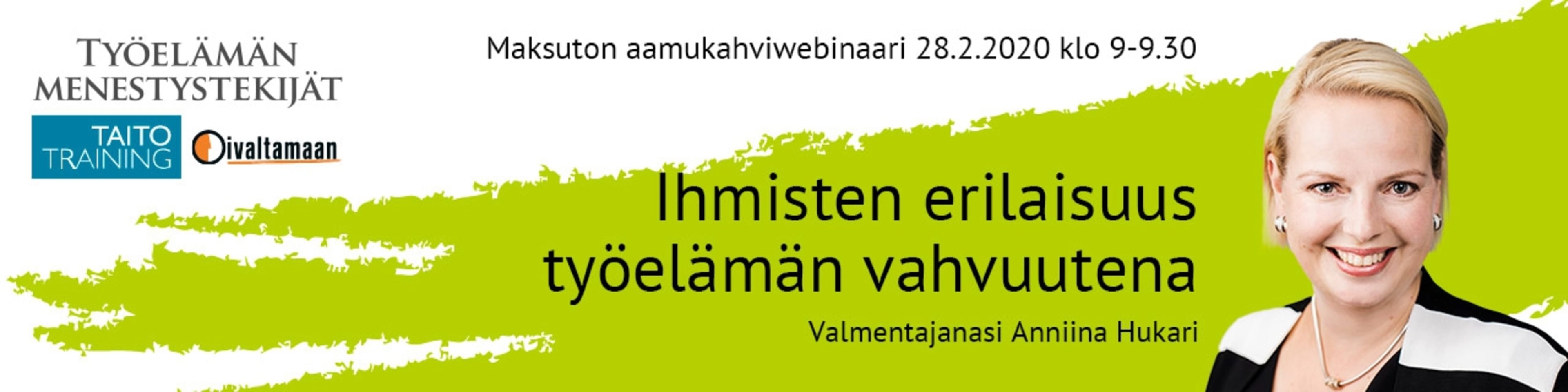 Tervetuloa pysähtymään näiden teemojen äärelle maksuttomassa aamukahviwebinaarissa. Webinaari on osa Työelämän menestystekijät- webinaarisarjaa, jota pitävät Anniina Hukari (TAITO TRAINING) sekä Jaana Hautala (OIVALTAMAAN).