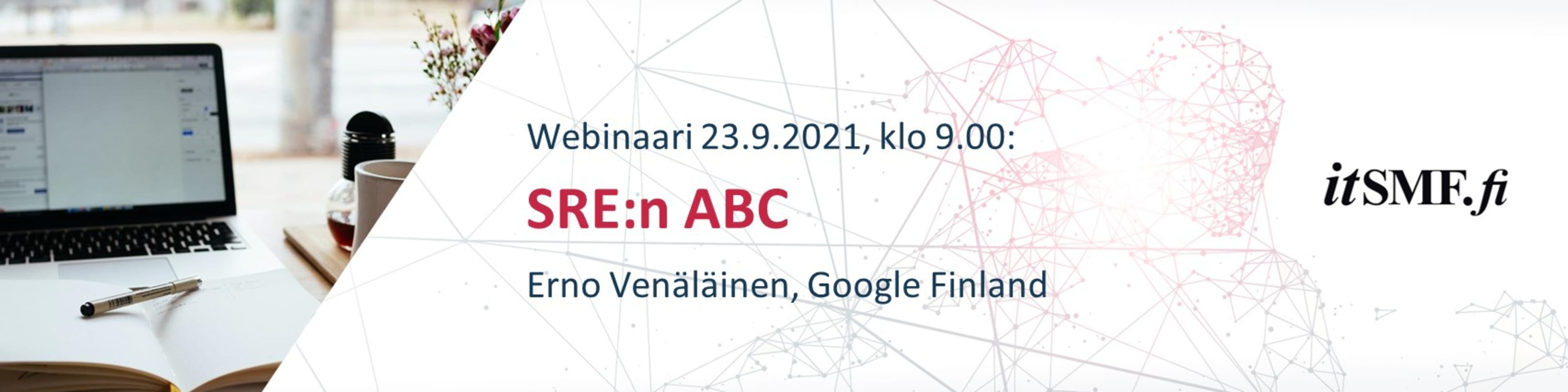 Tervetuloa itSMF Finlandin maksuttomaan webinaariin 23.9.2021 klo 9.00–10.00! Aiheena on SRE:n ABC ja puhujana on Erno Venäläinen, Google Finland Oy.