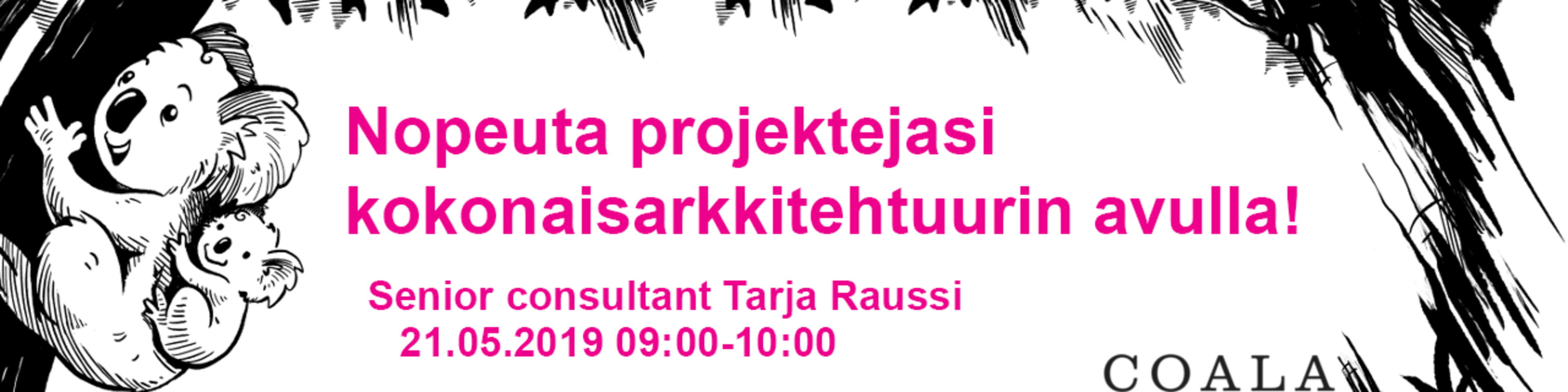 9.00-9.45 Nopeuta projektejasi kokonaisarkkitehtuurin avulla! Puhuja: Tarja Raussi, Senior Consultant (Coala)