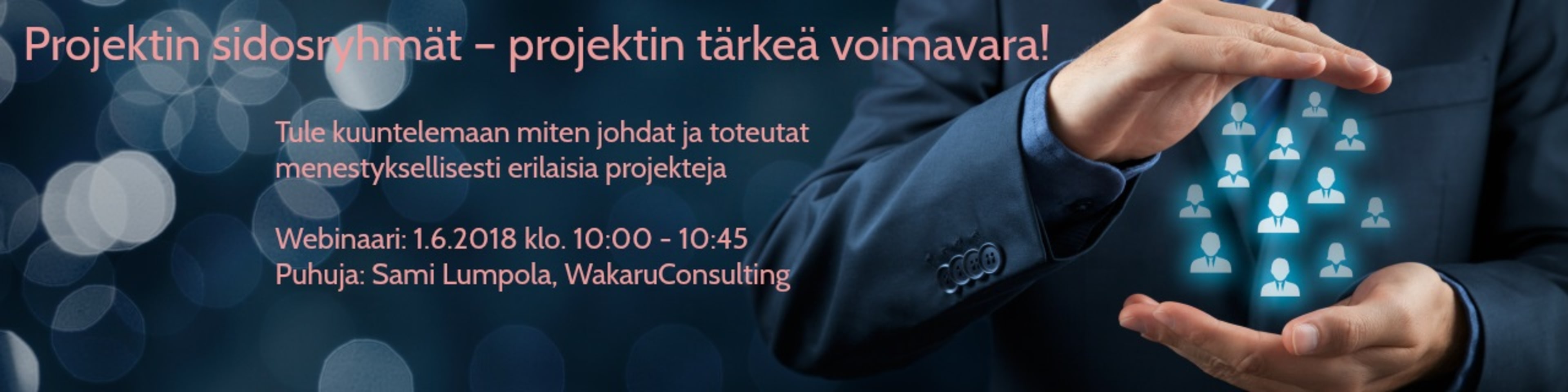 Tule webinaariin syventämään tietämystä projektin sidosryhmistä. Webinaarissa kuullaan projektin sidosryhmien tärkeydestä sekä tarjotaan konkreettisia esimerkkejä keinoista, joiden avulla voidaan löytää ratkaisuja yllättäviinkin sidosryhmähaasteisiin.
