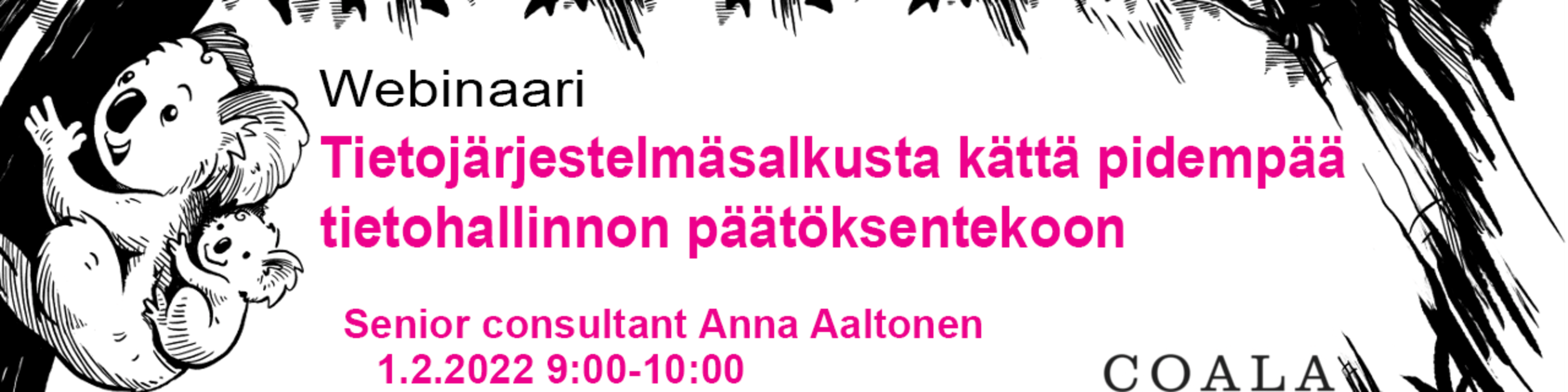 9.00-10:00 Tietojärjestelmäsalkusta kättä pidempää tietohallinnon päätöksentekoon. Puhuja: Anna Aaltonen, Senior Consultant (Coala)