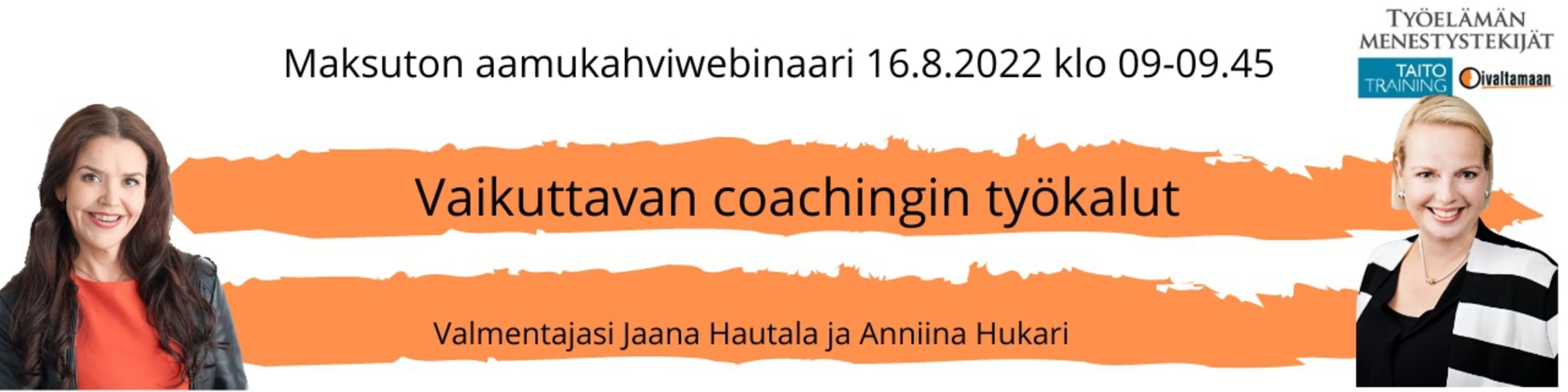 Webinaarin loppuun kuulet 22.9.2022 alkavat 3 päivän kestoinen Vaikuttavan coachingin työkalut ja menetelmät- koulutuksesta.