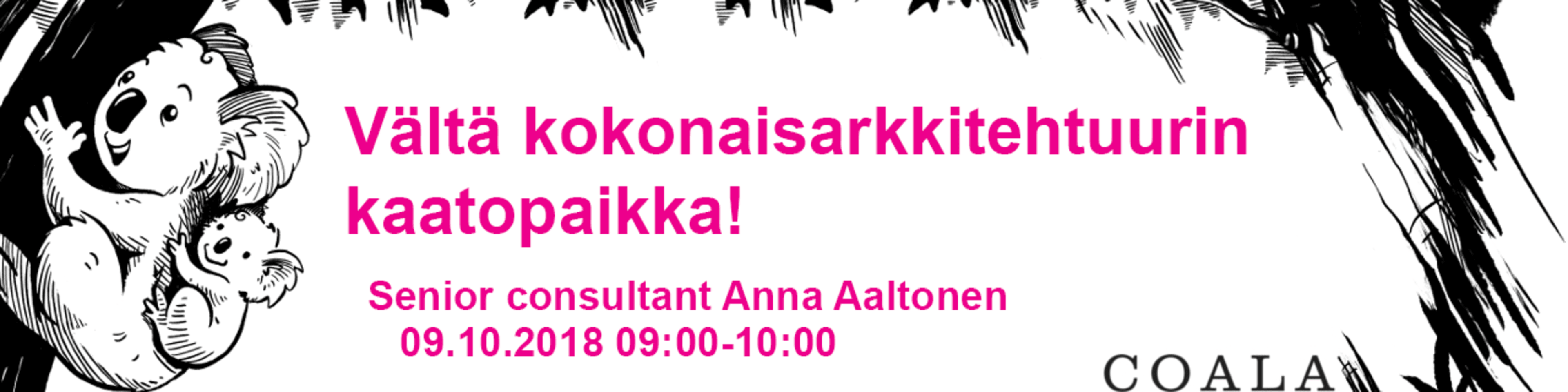 9.00-9.45 Vältä kokonaisarkkitehtuurin kaatopaikka! Puhuja: Anna Aaltonen, Senior Consultant (Coala)