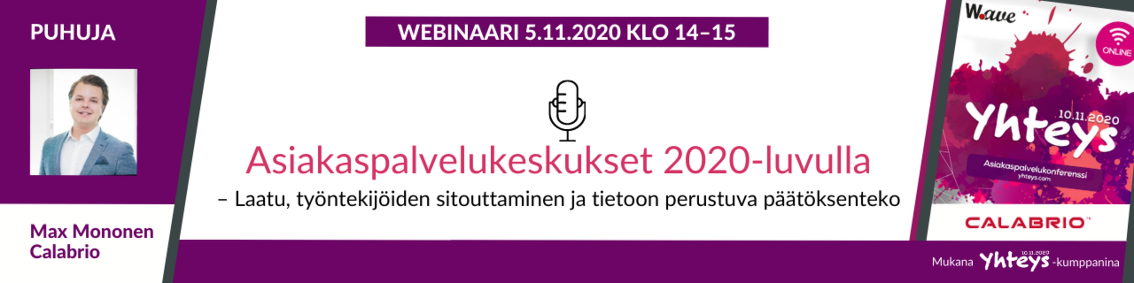 Webinaari on ilmainen. Tilaisuus on osa Wave-jäsentoimintaa. Calabrio on yksi Wave-jäsenistä sekä Yhteys-konferenssin kumppani.